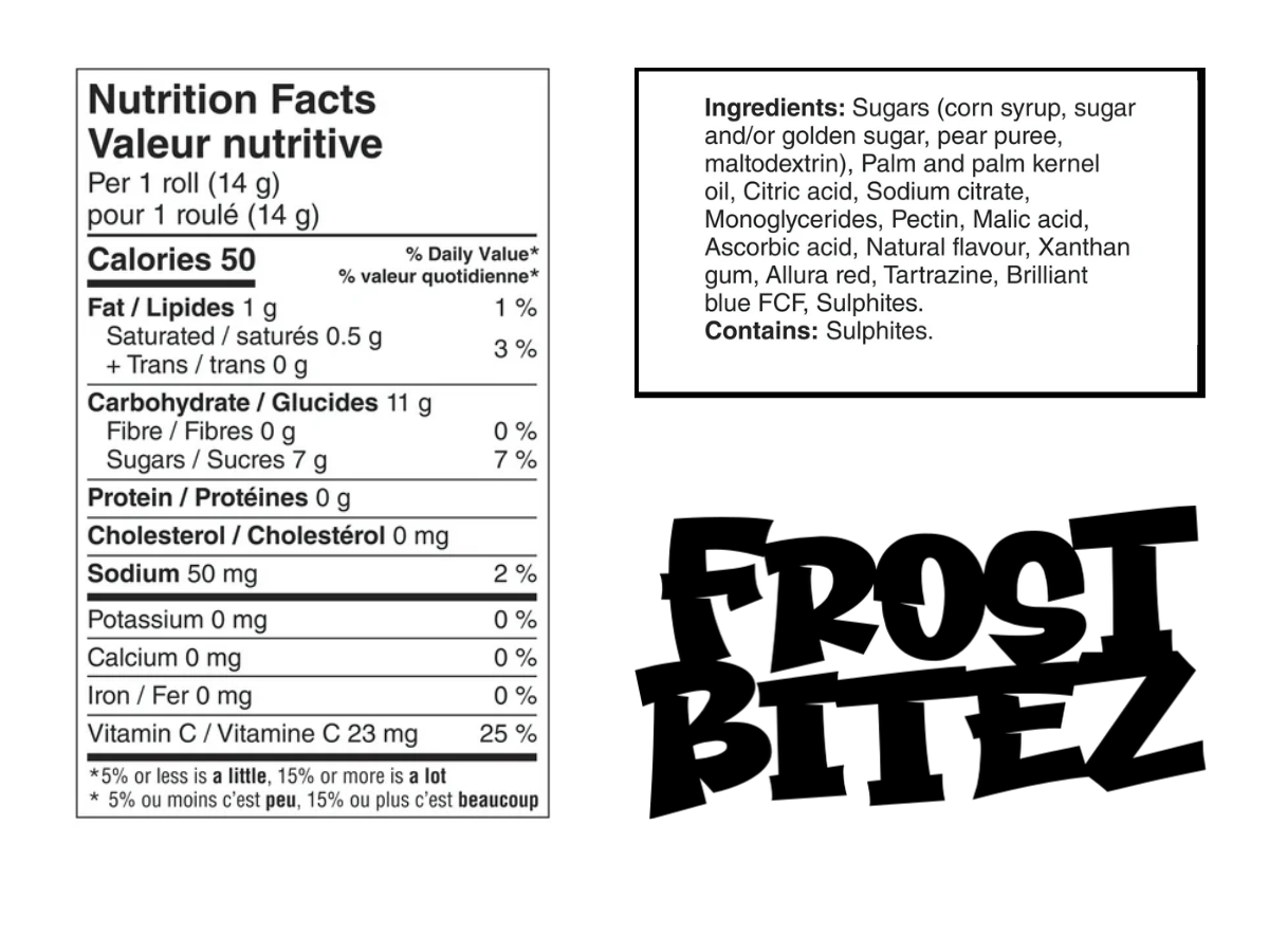 Corn Syrup, Sugar, Pear Puree, Maltodextrin, Palm and/or Palm Kernel Oil. Contains 2% or less of: Citric Acid, Sodium Citrate, Monoglycerides, Fruit Pectin, Malic Acid, Vitamin C (ascorbic acid), Natural Flavor, Color (red 40, yellows 5 & 6, blue 1).